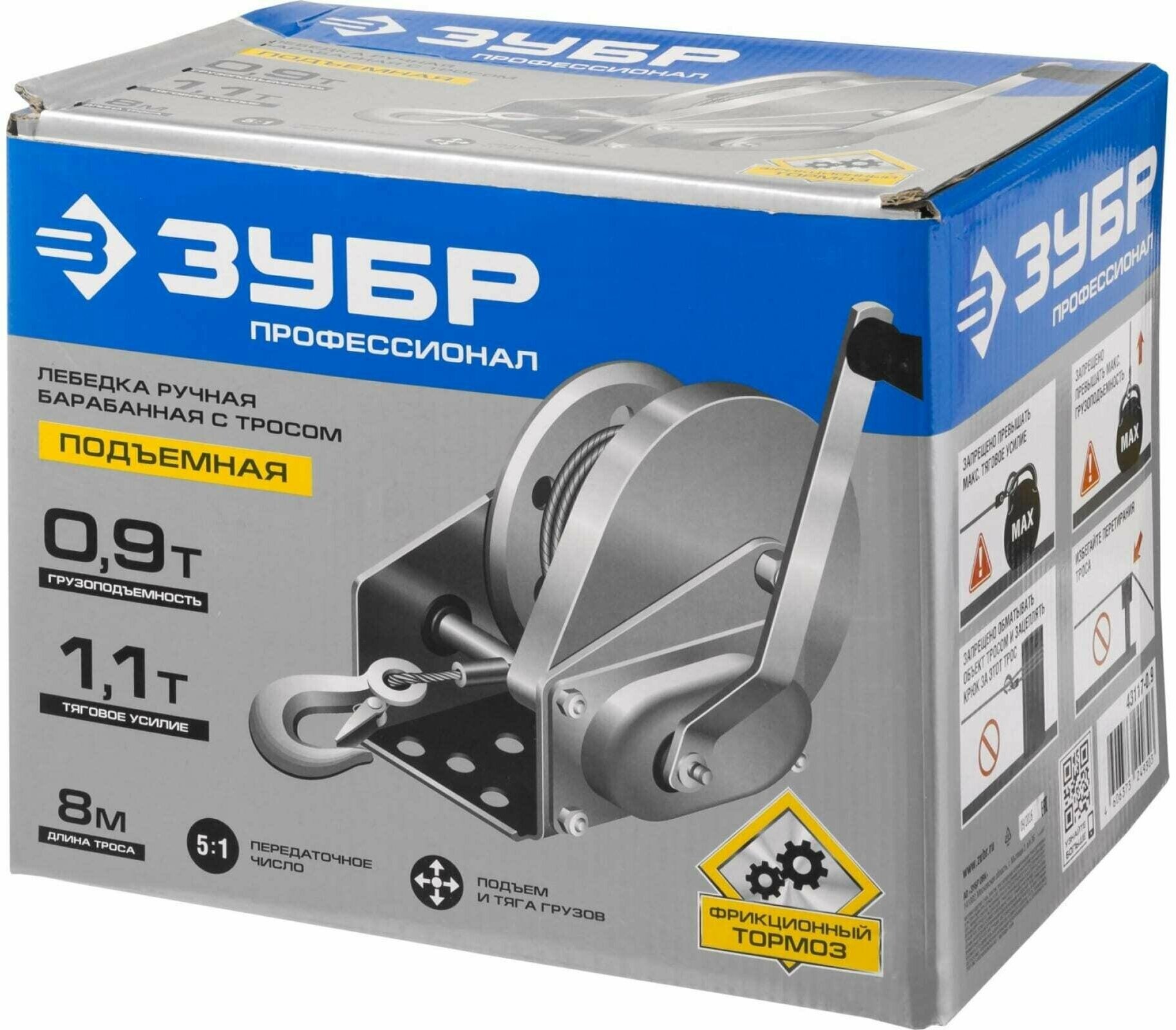 Steel cable: length 8 m, diameter 5 mm; gear ratio 5:1; friction brake; maximum pulling force 1.1 t