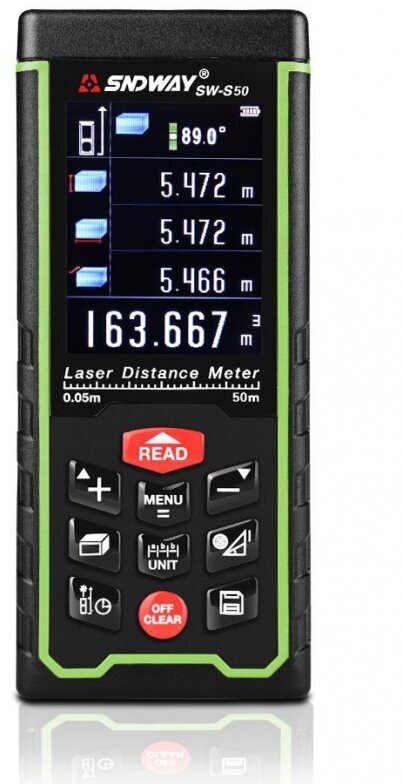 Type: laser, measurement range without reflector: 50 m, minimum measurement distance: 5 cm, measurement accuracy: 2 mm, number of reference points: 4, number of stored measurements: 100, color display, backlight for