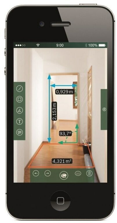 Type: laser, measurement range without reflector: 50 m, minimum measurement distance: 5 cm, measurement accuracy: 2 mm, number of reference points: 3, number of stored measurements: 10, color display, touch screen