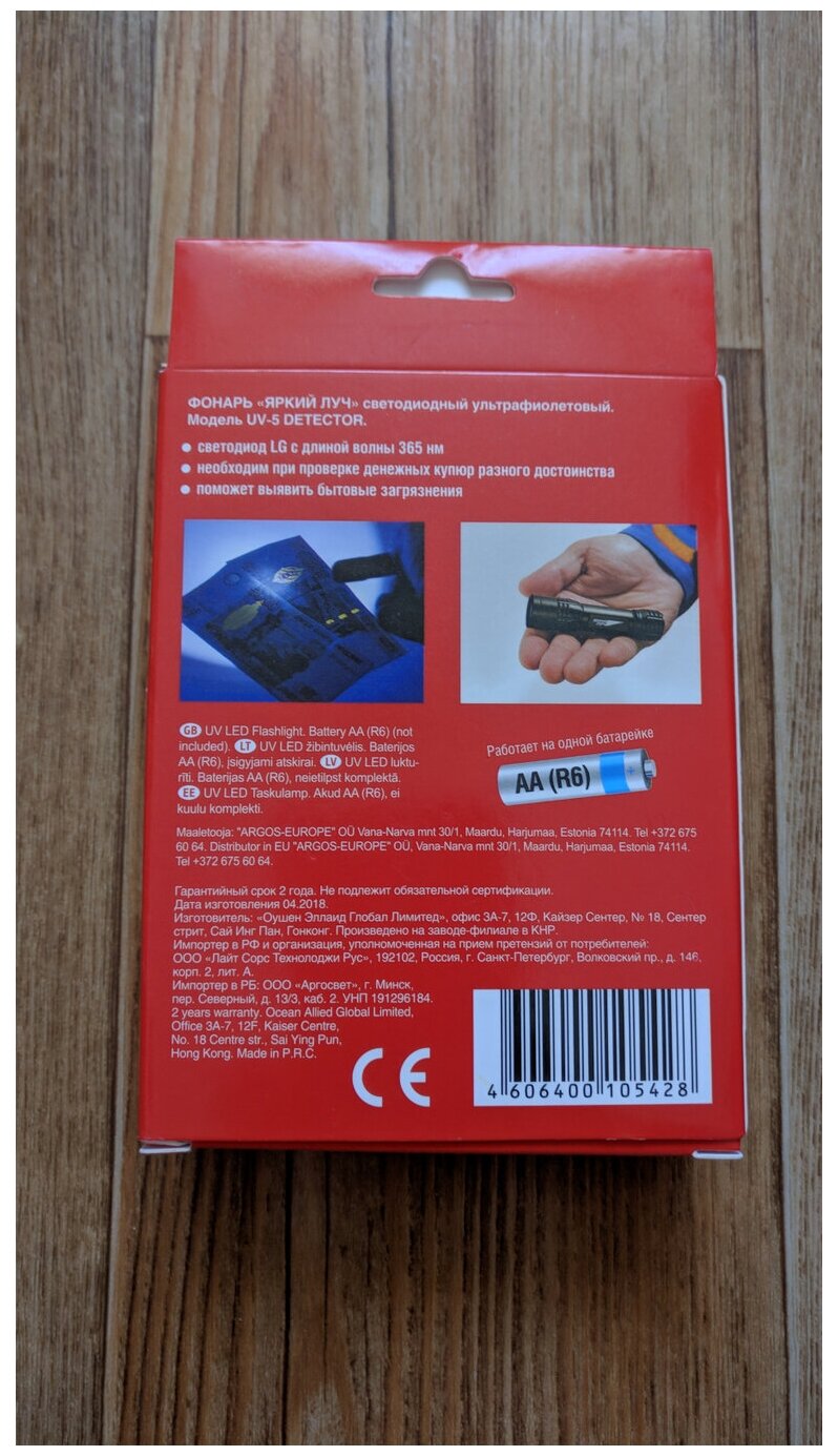 Type: torch-detector, portable, functions: detection of counterfeit banknotes, detection type: ultraviolet, power supply: from AA batteries
