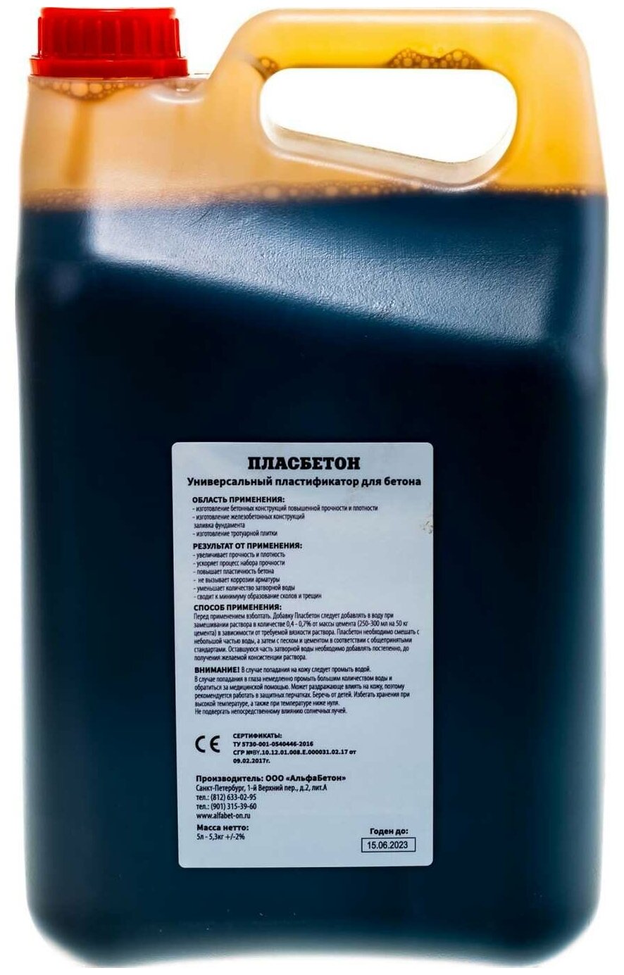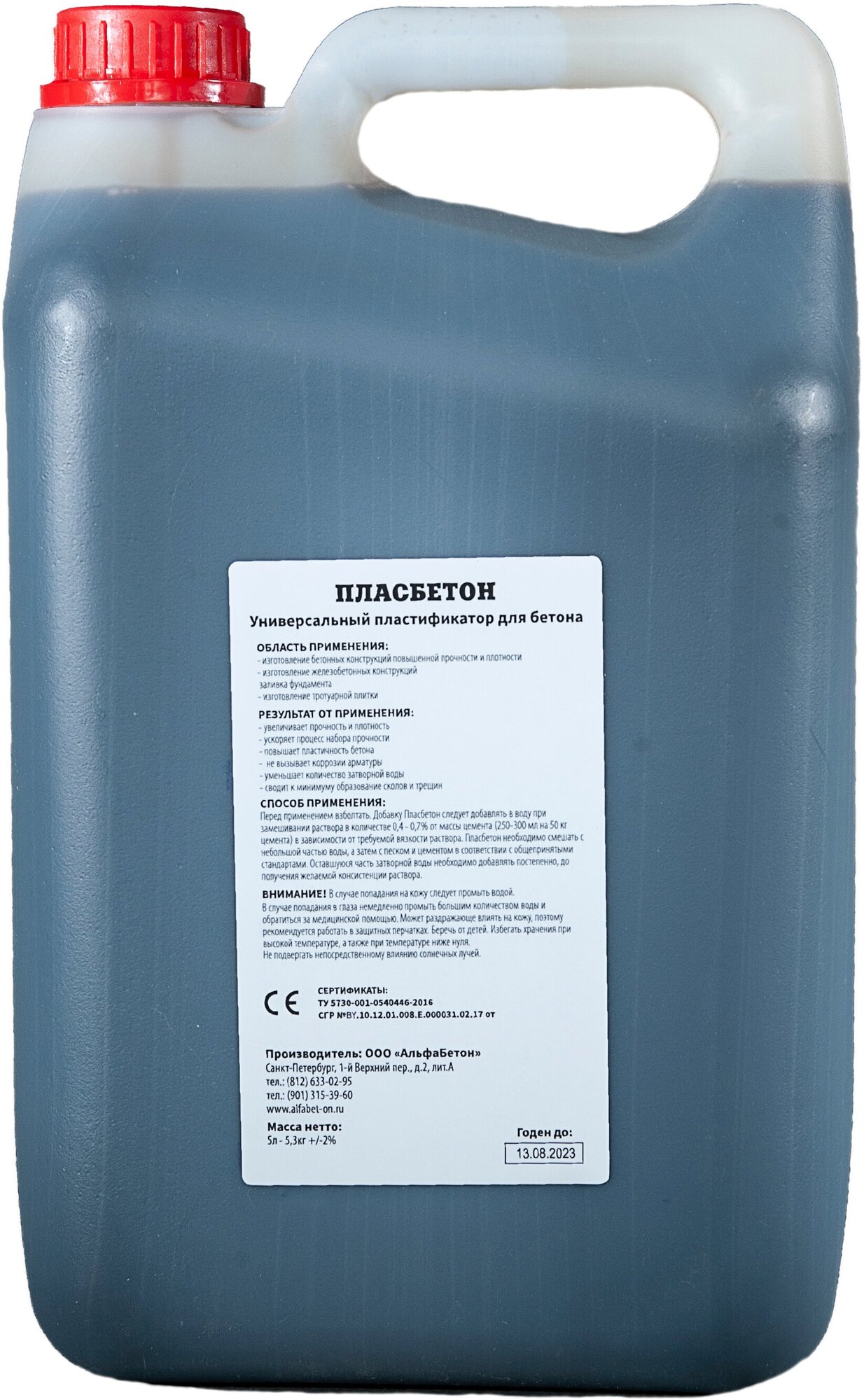 Additional Information: Consumption: 0.4-0.7% by weight of cement 0.20 - 0.35 l per 50 kg; <br>one canister Plasbeton 5 l for 15 bags of cement