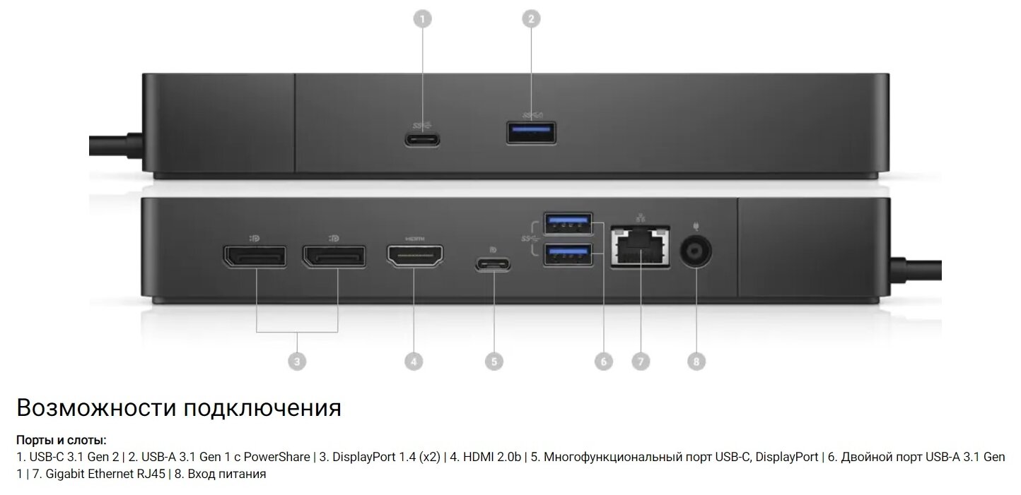 For Apple, DELL laptops, connection interface: USB 3.2 gen1 Type-C, interfaces: Display Port x 2, Ethernet, HDMI, USB 3.2 gen1 Type-A x 3, USB 3.2 gen2 Type-C, USB-Type C power port , power unit