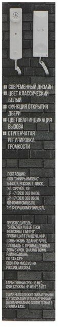 Type: audio tube, height: 200 mm, width: 54 mm, depth: 40 mm, mounting method: wall-mounted, material: plastic, input voltage: 12 V, number of connected subscribers: 1, suitable for: home station