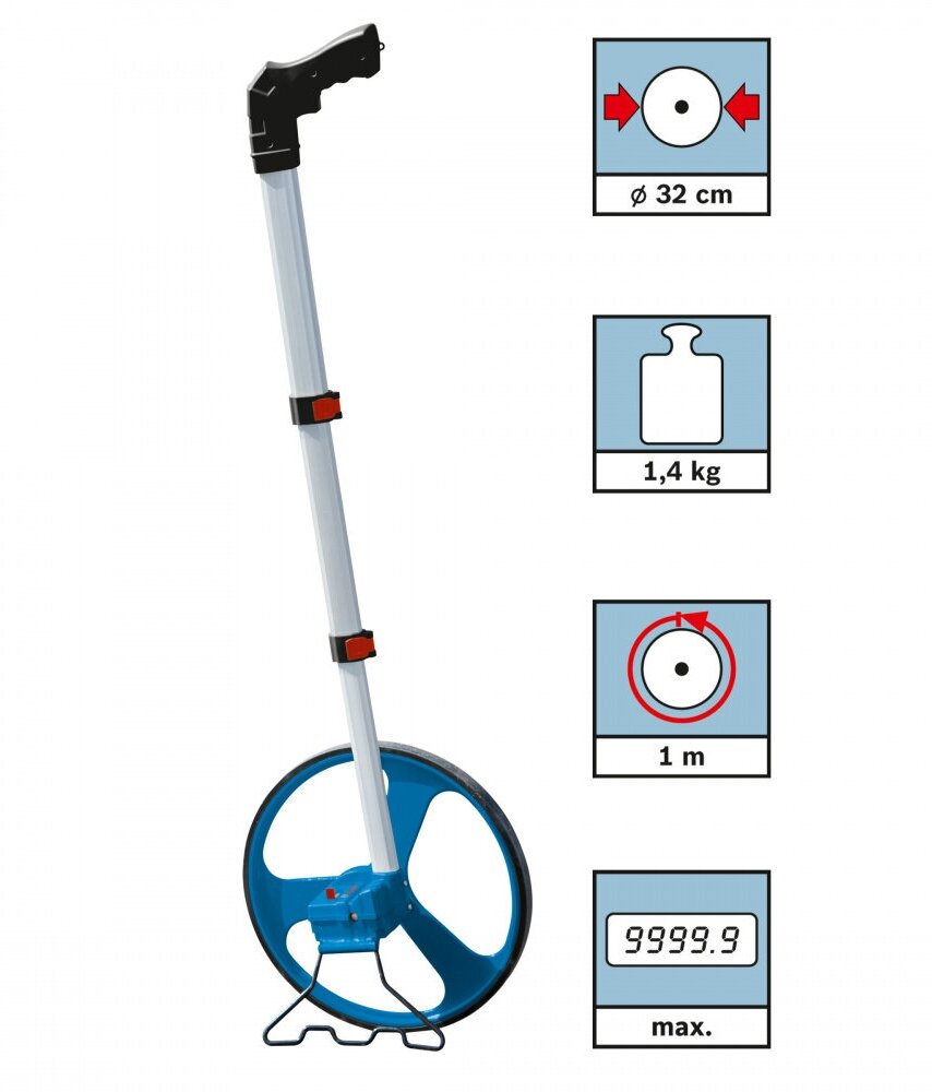 Type: analog, wheel diameter: 31.85 cm, length: 109 cm, maximum measuring range: 9999.90 m, measuring system: metric, wheel material: rubber