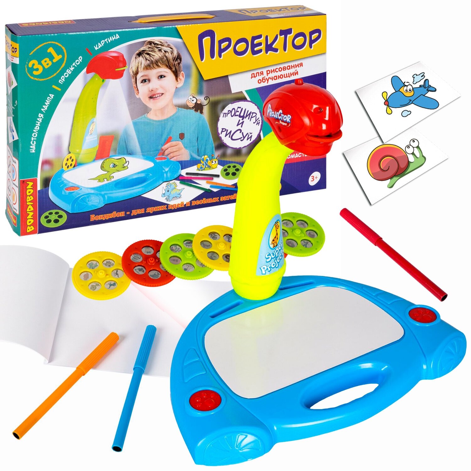 Educational projector, 6 discs, 36 templates, 6 markers, eraser, notepad