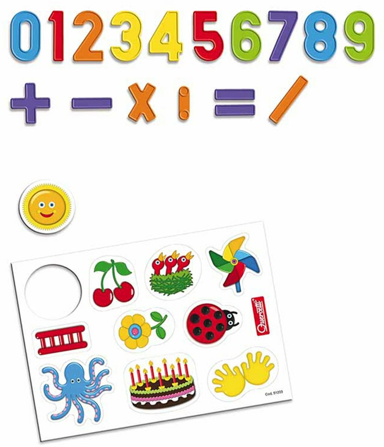 48 different numbers and math signs, 10 magnetic cards, drawing marker, marker eraser sponge, whiteboard stand