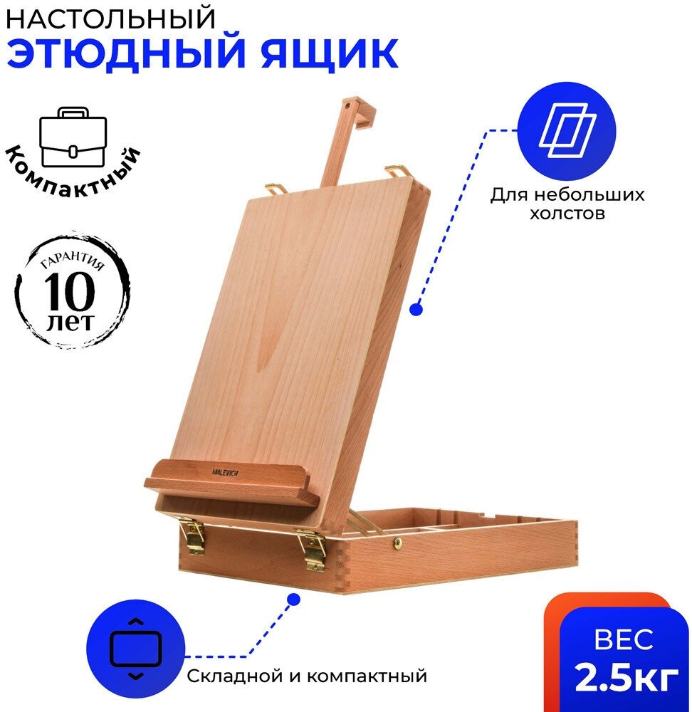Resistant to moisture and corrosion, with an adjustable canvas shelf, with an internal drawer for paints and tools, with a carrying handle; box dimensions - 26 x 37 x 9 cm