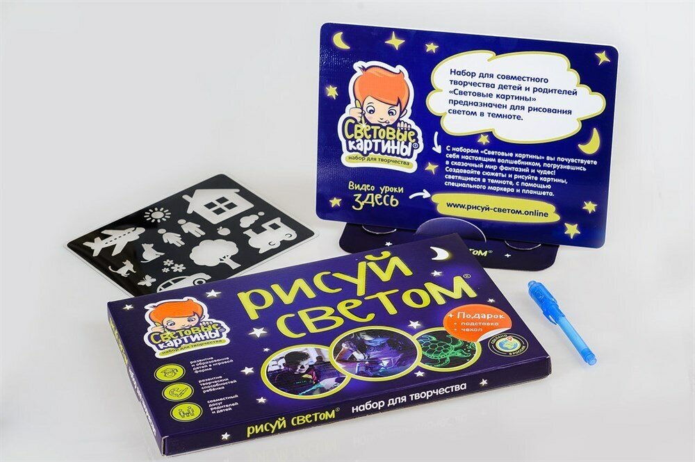 Tablet for drawing A4 format, marker, stand - easel for the tablet, plastic stencil with 13 images, light-proof fabric case for storing the tablet, instructions