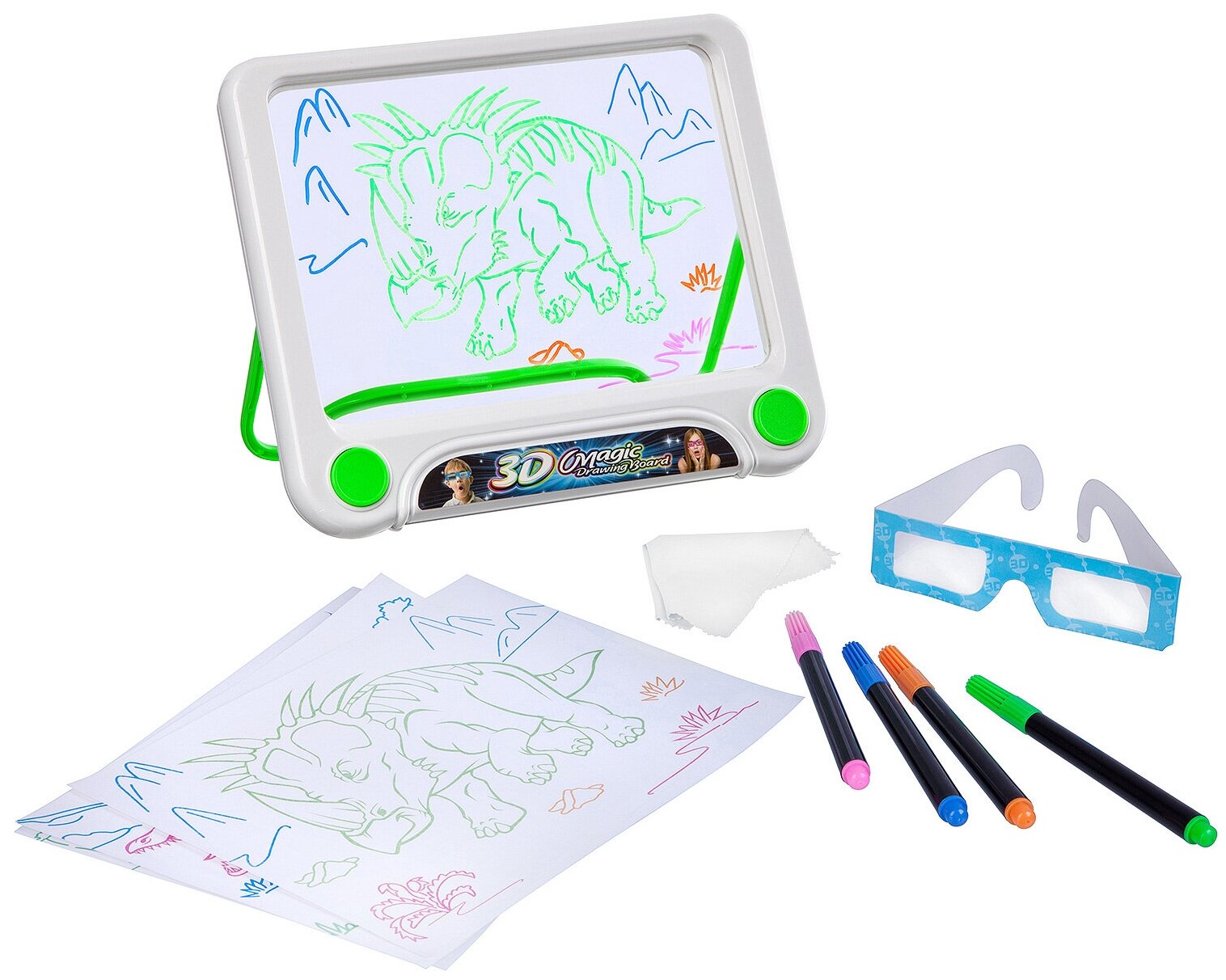 Tablet, 3D glasses, 4 markers, 3 double-sided stencils 6 pictures