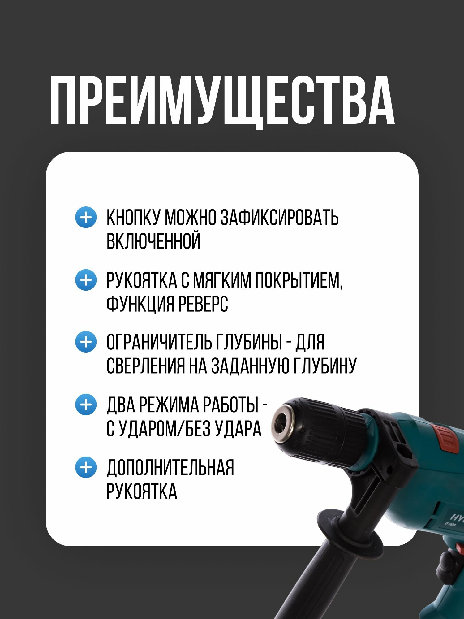 Functions: Work in the rack of a drilling machine, reverse, speed adjustment, Quick-release fastening, smooth speed change, Drilling, Hammer drilling, Impact mode, speed adjustment, reverse, work