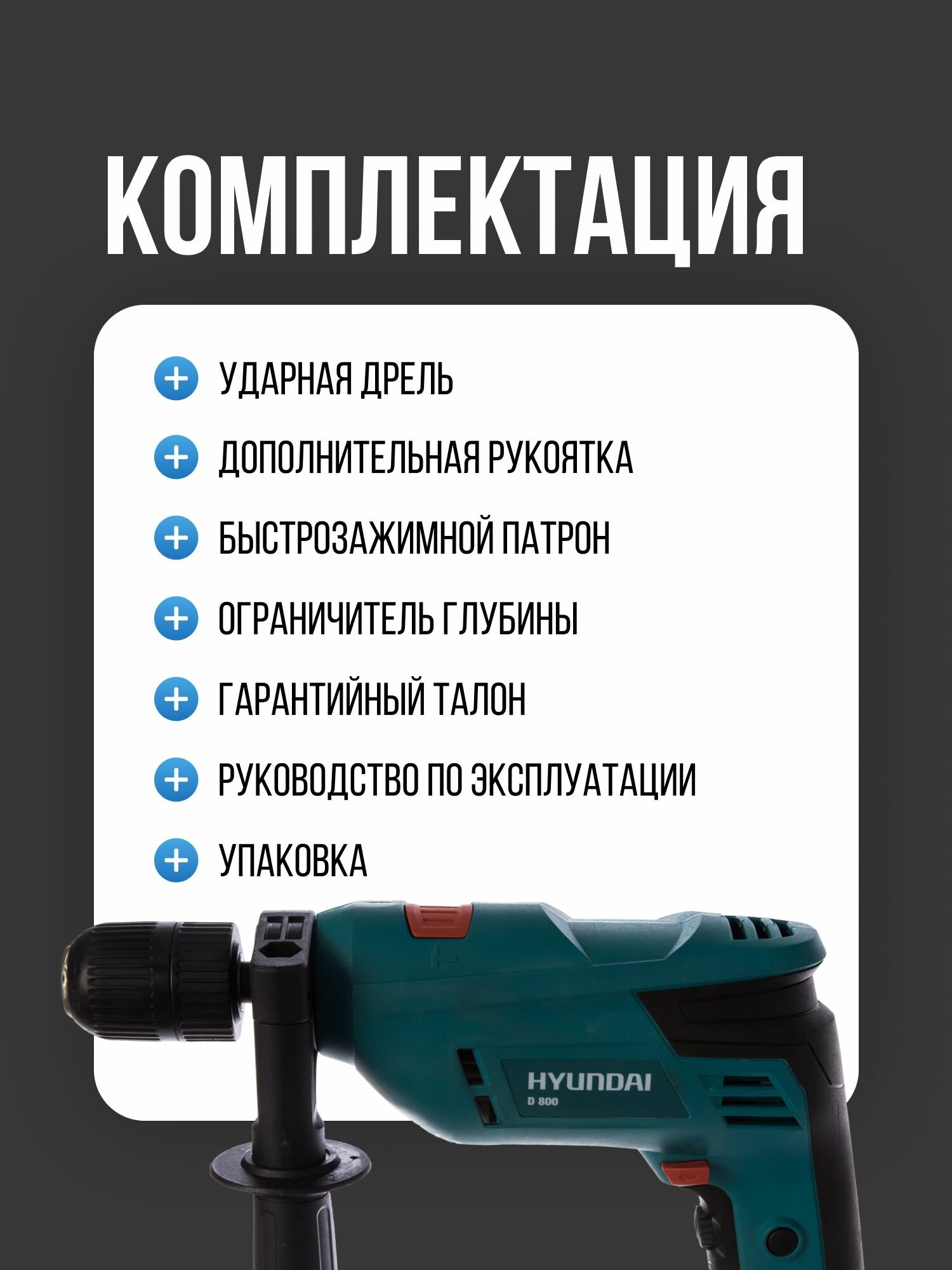 Description: Type: drill, power type: mains, presence of impact for drill: impact, chuck type: quick-release, functions: work in a drilling machine rack, reverse, rotation speed adjustment, Quick-release fastening, Smooth change