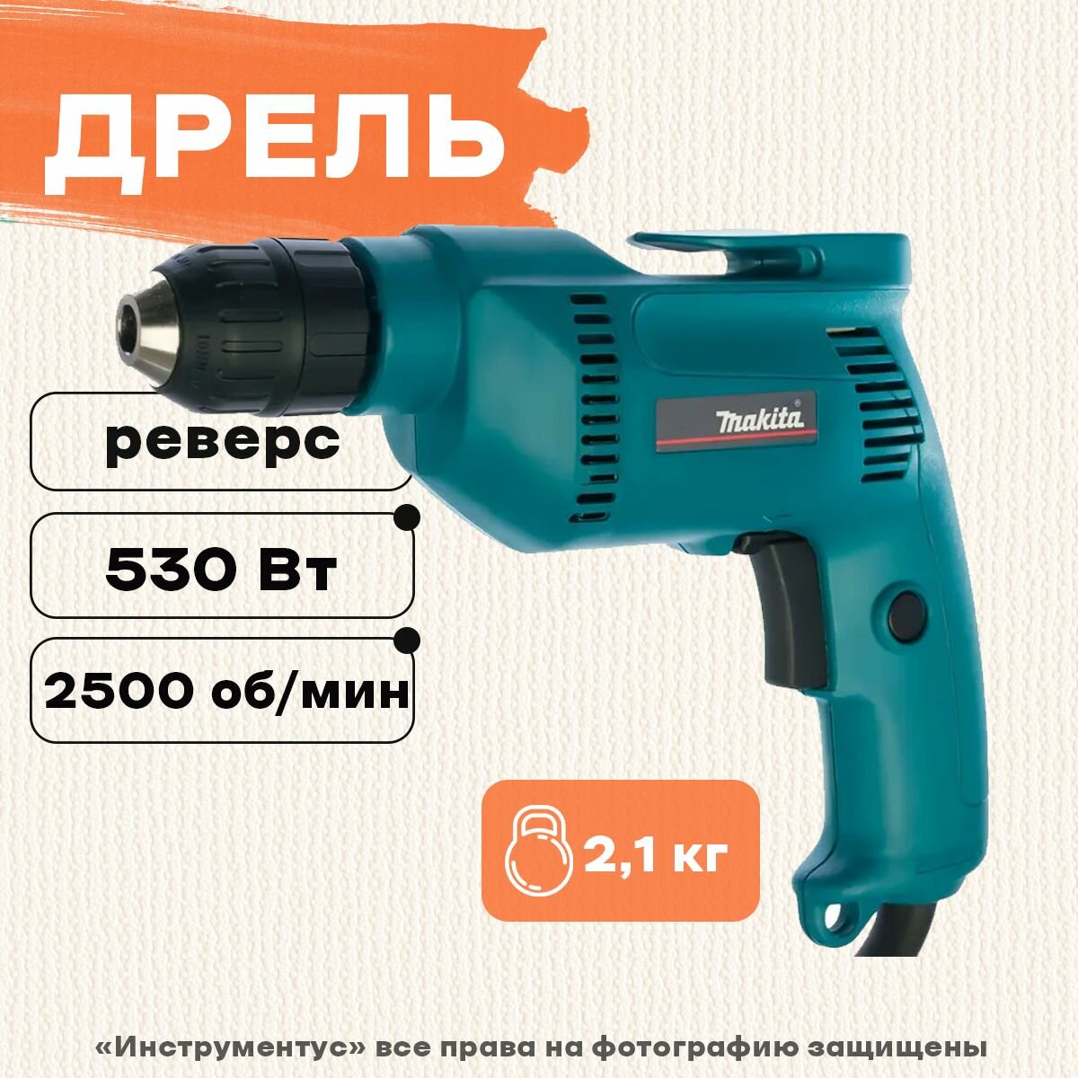 Type: drill, power type: mains, presence of impact for drill: hammerless, chuck type: quick-release, functions: reverse, speed adjustment, Stepless speed adjustment, Drilling, hour adjustment