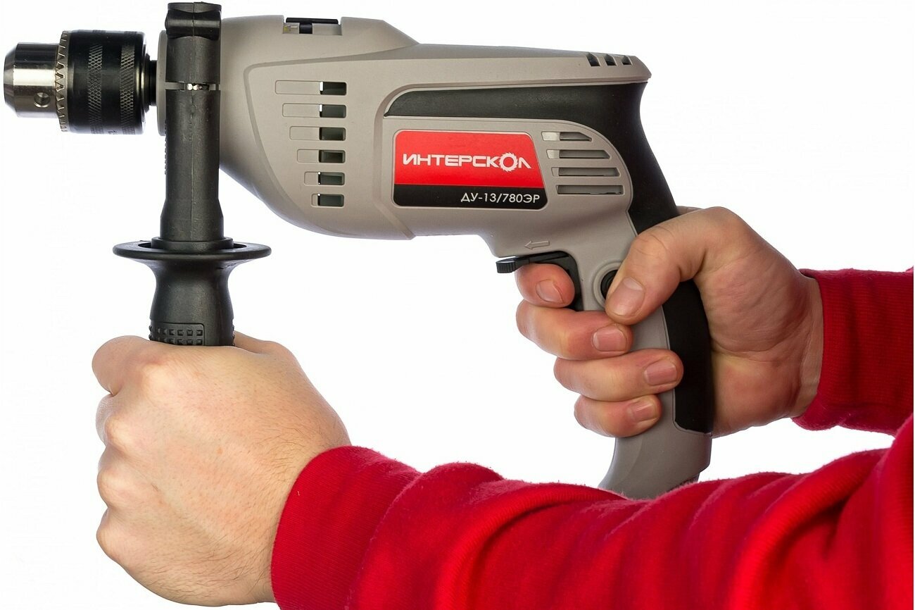 Additional handle, drilling depth limiter, drill chuck with key installed on the machine