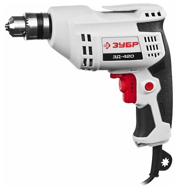 Type: drill, power type: mains, presence of impact for drill: hammerless, chuck type: key, functions: reverse, speed adjustment, power consumption: 420 W, design features: button lock on