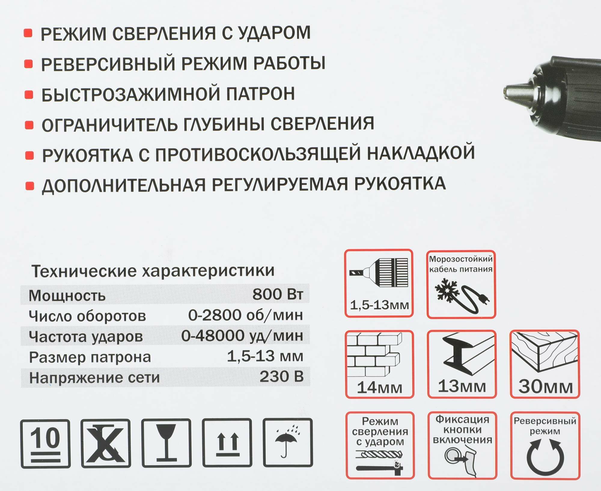 Description: Type: drill, power type: mains, presence of impact for drill: impact, chuck type: key, functions: reverse, speed adjustment, power consumption: 701 W, maximum torque: 35 Nm, design features
