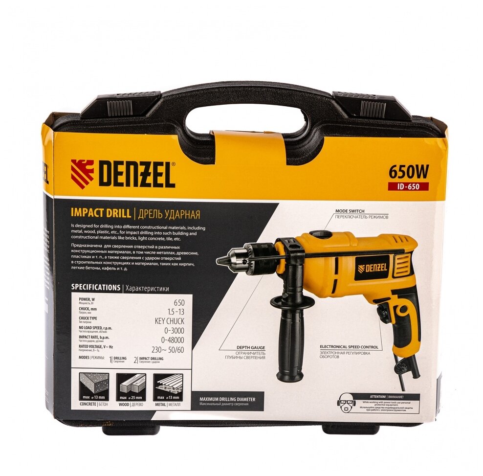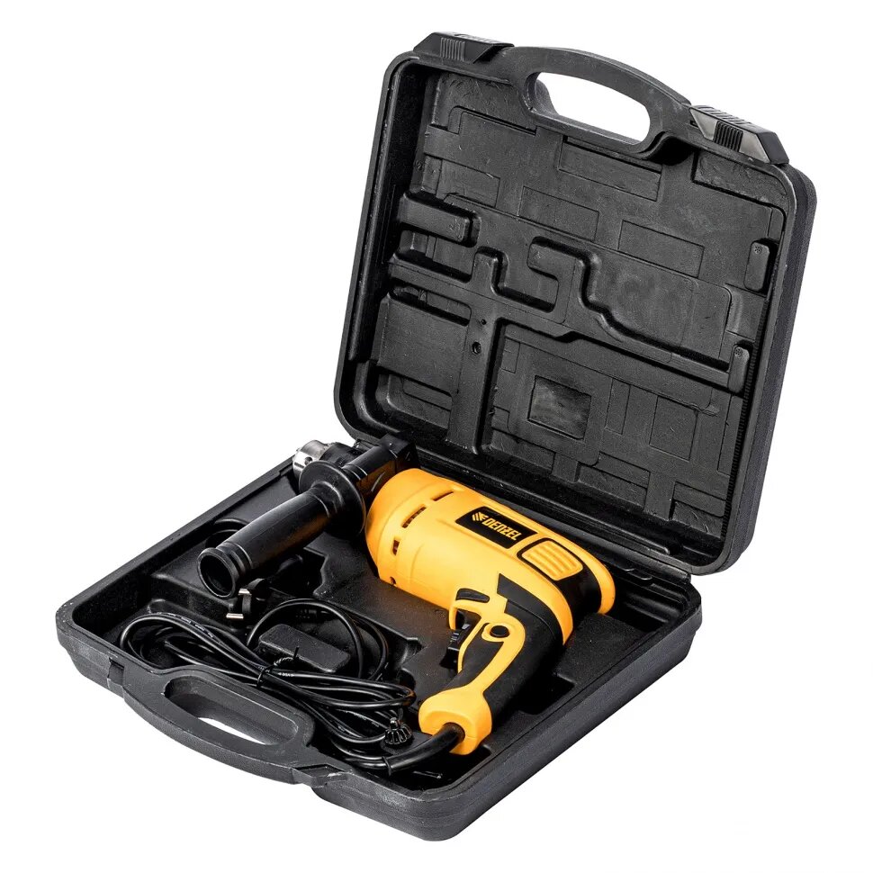 Electric impact drill - 1 piece; cartridge key - 1 piece; side handle - 1 piece; drilling depth limiter - 1 piece; set of spare carbon brushes - 1 piece; instructions - 1 piece; warranty card - 1 piece