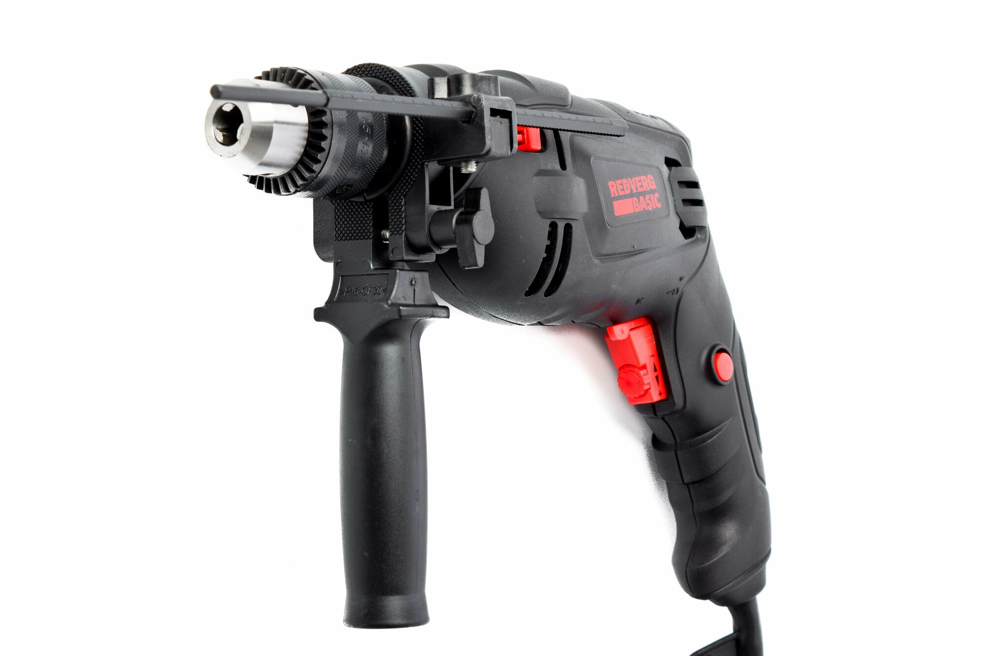 Power button lock, additional handle, drilling depth limiter, rubber-coated handles