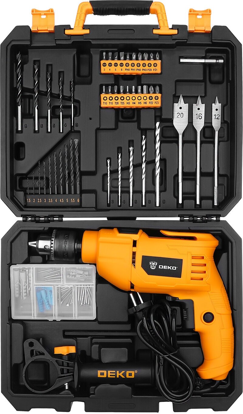 1 pc impact drill 5 pcs wood drill: 3,4,5,6,8mm 5 pcs masonry drill: 3,4,5,6,8mm 10 pcs twisted drill: 1.5,2,2.5,3,3.5,4 ,4.5,5,5.5,6mm 20 pcs bits 25L: SL3,4,5,6,PH0,1,2,3,PZ0,1,2,3,T10,15,20,25,H3,4,5 ,6 1 piece magnetic holder for bits 60mm 3 pieces fl