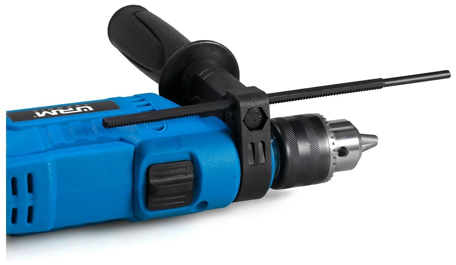 Corded impact drill, removable side handle, chuck tightening key, drilling depth limiter, instructions