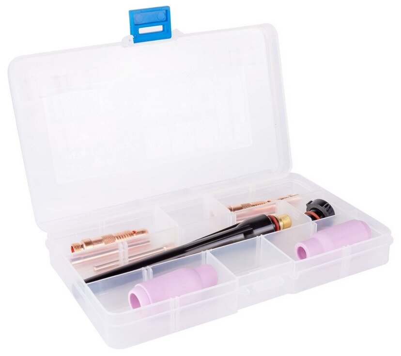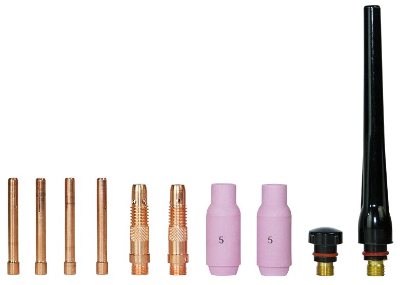 Set TIG 17/18/26: collet body 1.6 mm - 1 pc., collet body 2.4 mm - 1 pc., ceramic nozzle No. 5 - 2 pcs., collet 1.6 - 2 pcs., collet 2 ,4 - 2 pcs., short cap - 1 pc., long cap - 1 pc.