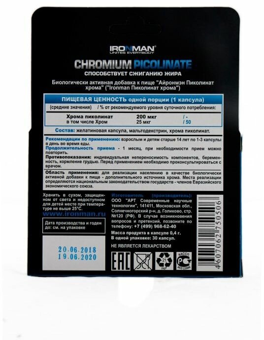 Composition: chromium picolinate Lonza Ltd., Switzerland, maltodextrin, gelatin; does not contain sugar, salt, preservatives, artificial flavors and colors; recommendations for use: 1 capsule 1-3 times a day with meals; n