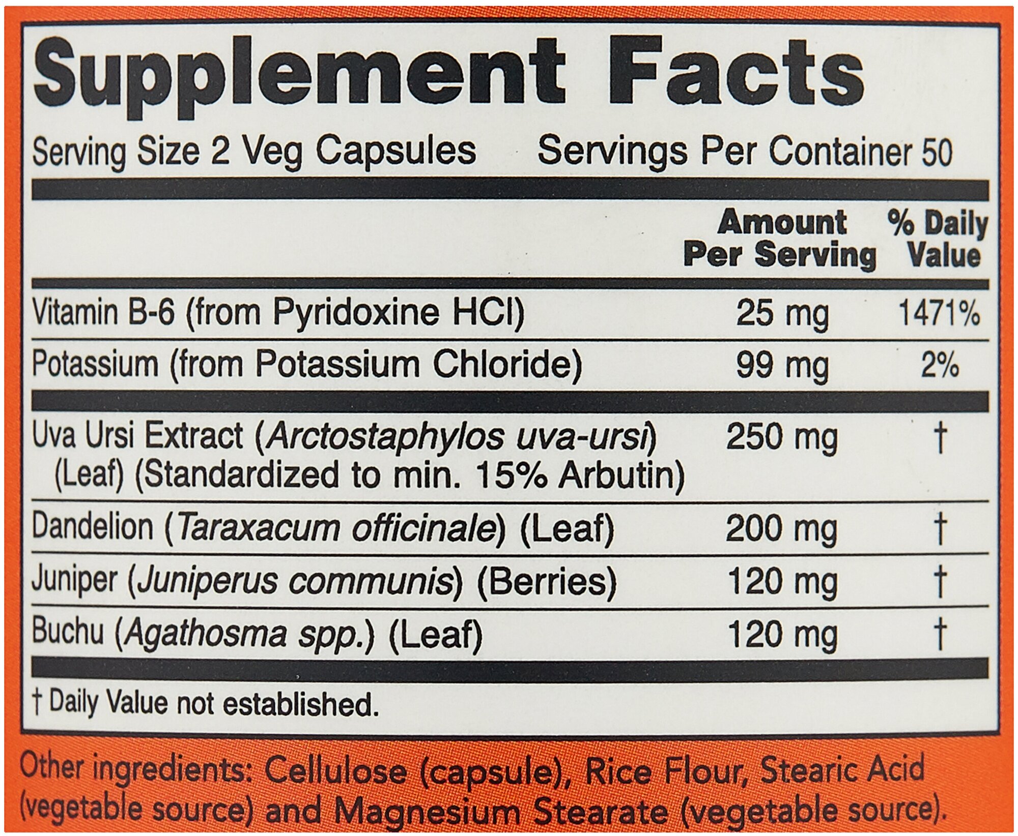 1 serving 2 capsules:<br/> Active Ingredients: Vitamin B-6 from Pyridoxine HCI 25mg, Potassium from Potassium Chloride 99mg, Uva Ursi Arctostaphylos uva-ursi Extract 250mg, Taraxacum officinale Dandelion 150mg, Juniper Juniperus communis - 120mg, I'm figh