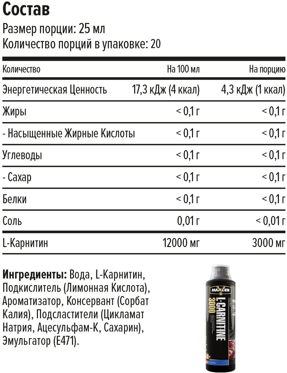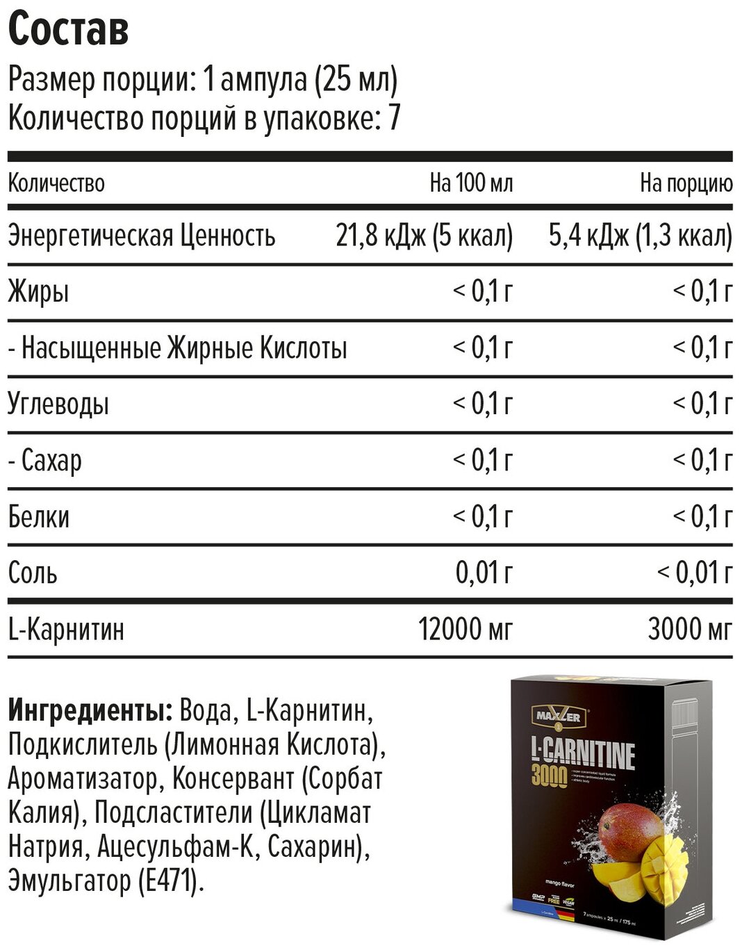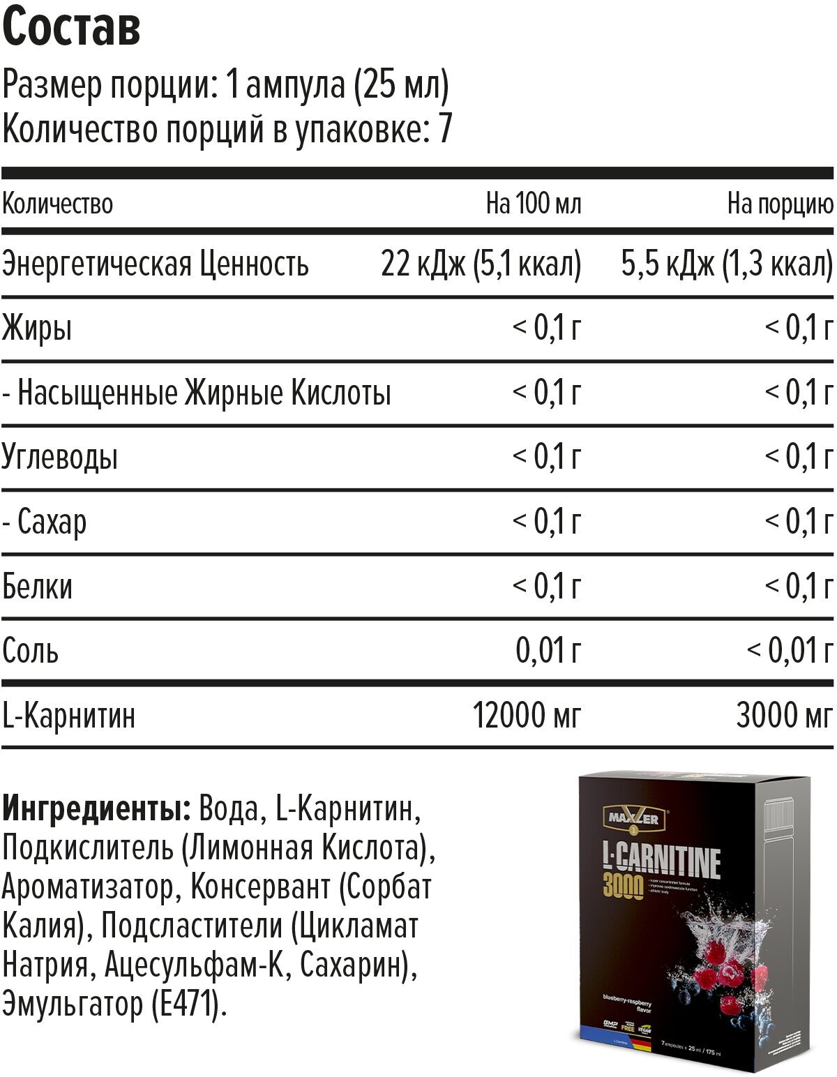 Description: Type: L-carnitine, dosage form: ampoules, dietary features: no aspartame, no maltodextrin, no sucralose, vegan, for whom: for women, for men