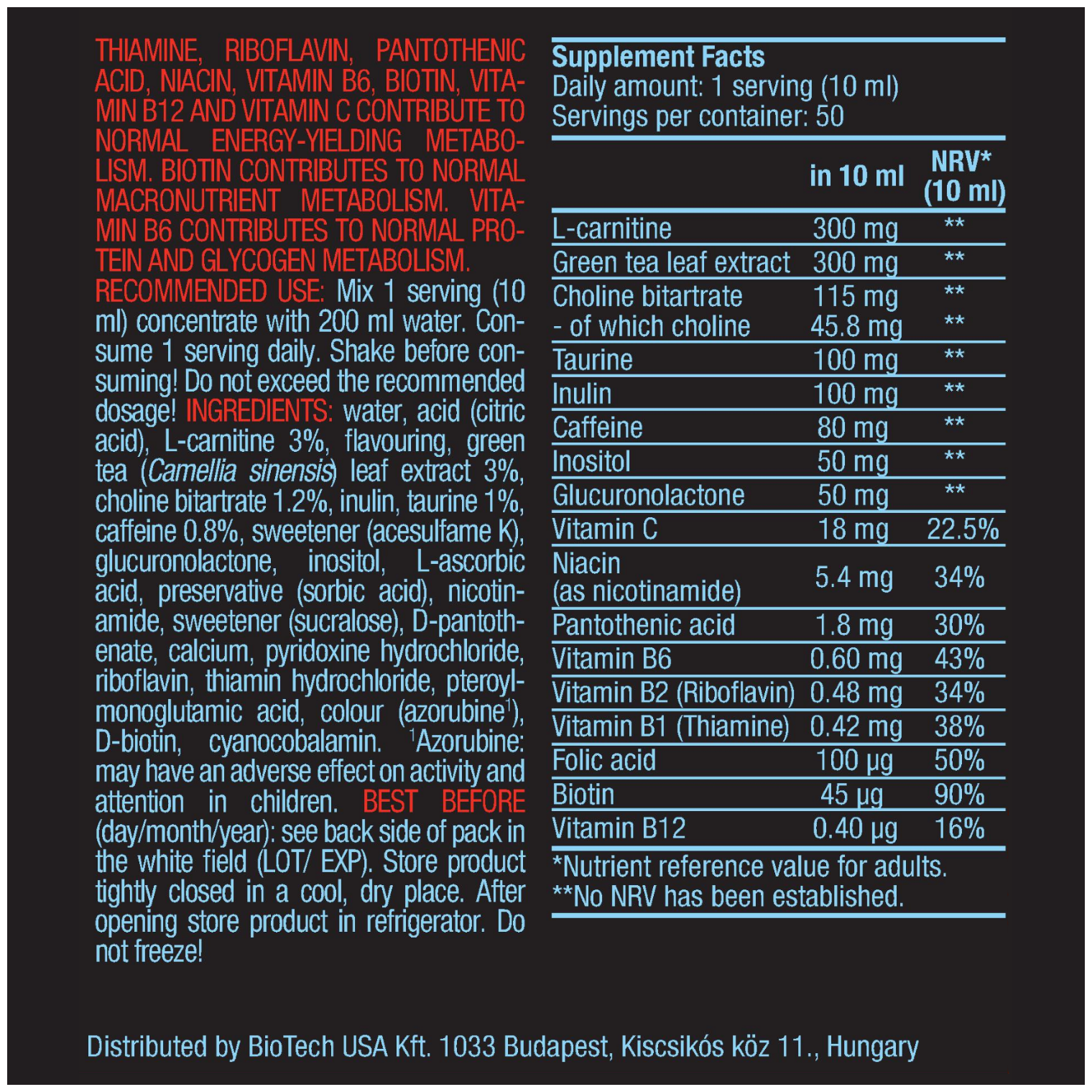 Composition: water, citric acid, L-carnitine, green tea extract, choline bitartrate, taurine, insulin, caffeine, glucuronolactone, inositol, sweeteners: sucralose, acesulfame-K; preservative: potassium sorbate, fragrance, ascorbic acid