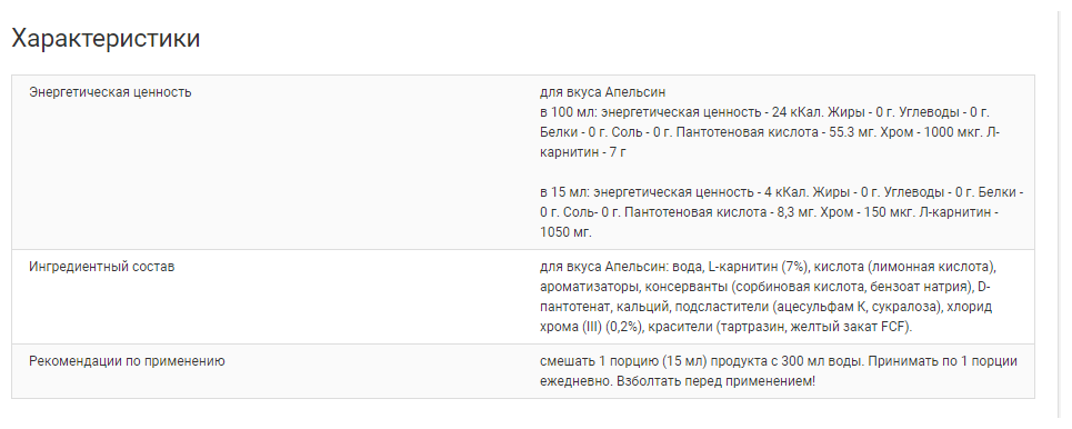 Composition for 1 serving 15 ml: L-carnitine - 1050 mg, protein - 1.05 g, chromium - 150 mg, pantothenic acid - 9 mg