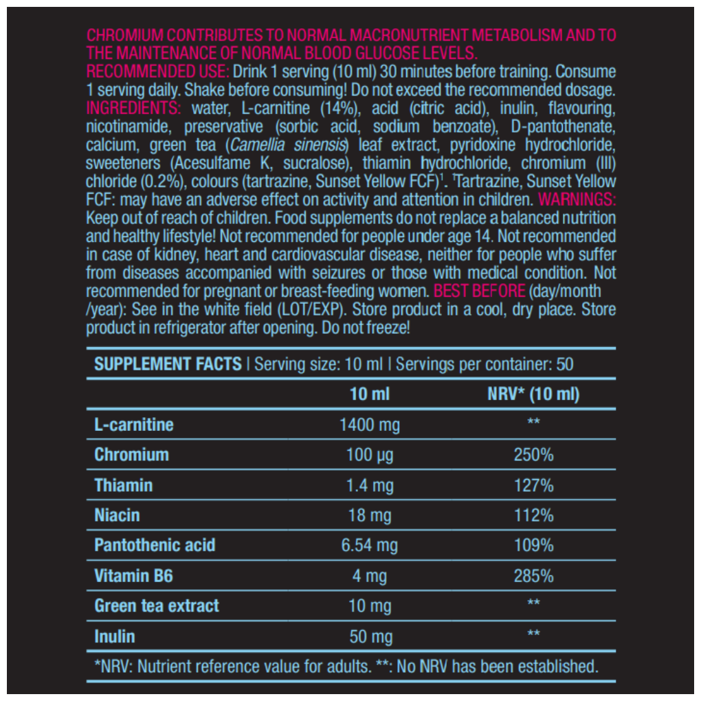 With this tov; Ingredients: Water, L-carnitine 7%, citric acid, sweeteners sucralose, acesulfame K, preservative potassium sorbate,