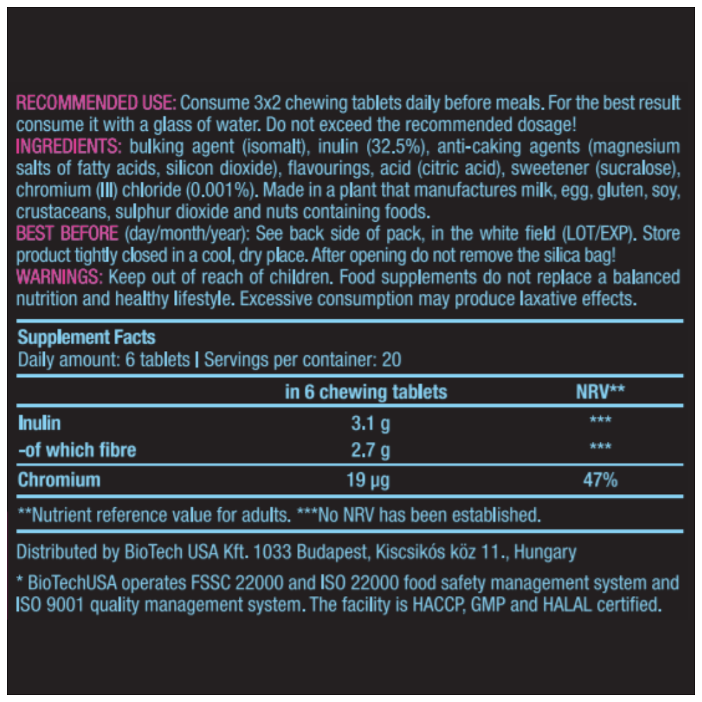 Composition: filler isomalt, inulin 32.5%, anti-caking agent magnesium salts of fatty acids, silicon dioxide, flavors, acidity regulator citric acid, sweetener sucralose, chromium III chloride 0.001%
