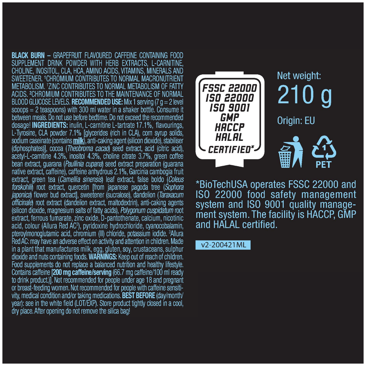 Additional Information: Contains anhydrous caffeine; composition: caffeine anhydryl, green coffee bean extract, carrier: E460, L-carnitine-L-tartrate, L-theanine, cocoa bean extract, anti-caking agents: E551, E470, black pepper extract, kale pepper powder