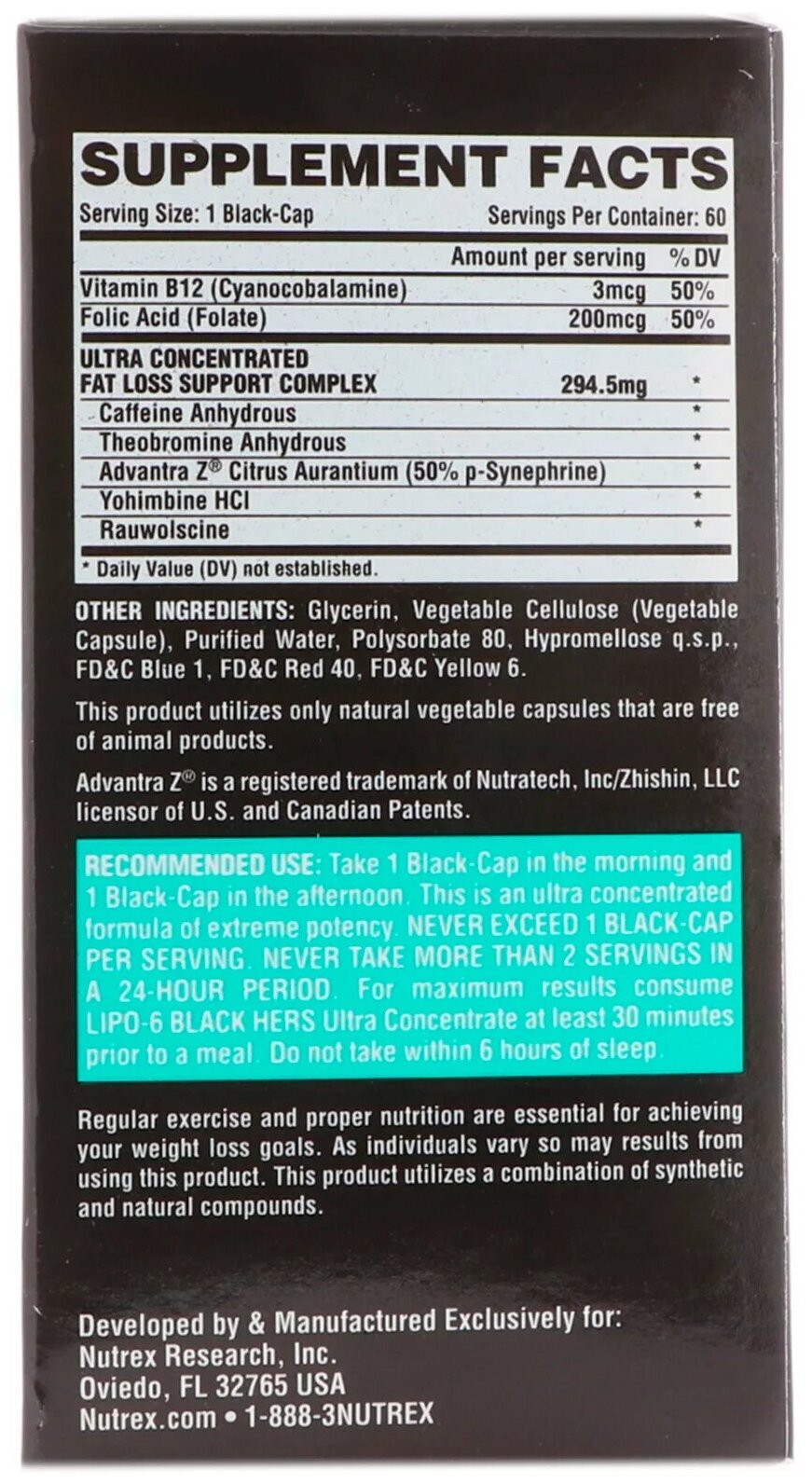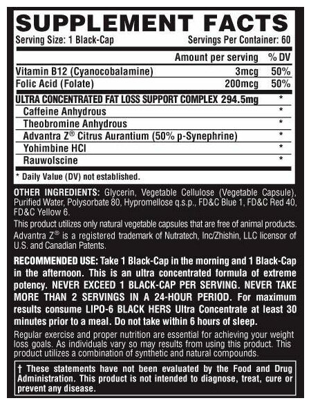 Composition: vitamin B12 as cyanocobalamin 3 mcg, folic acid 200 mcg, ultra concentrated fat destruction complex 294.5 mg, anhydrous caffeine, anhydrous theobromine, orange 50% synephrine, yohimbine, rauwolsc