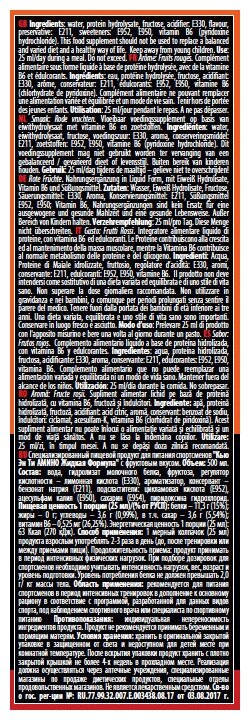 Composition: water, L-carnitine base, acidifier E330, flavors, vitamin B6, preservative E211 & E202, sweetener E955; Suggested Use: Take 10 ml once or twice a day before training