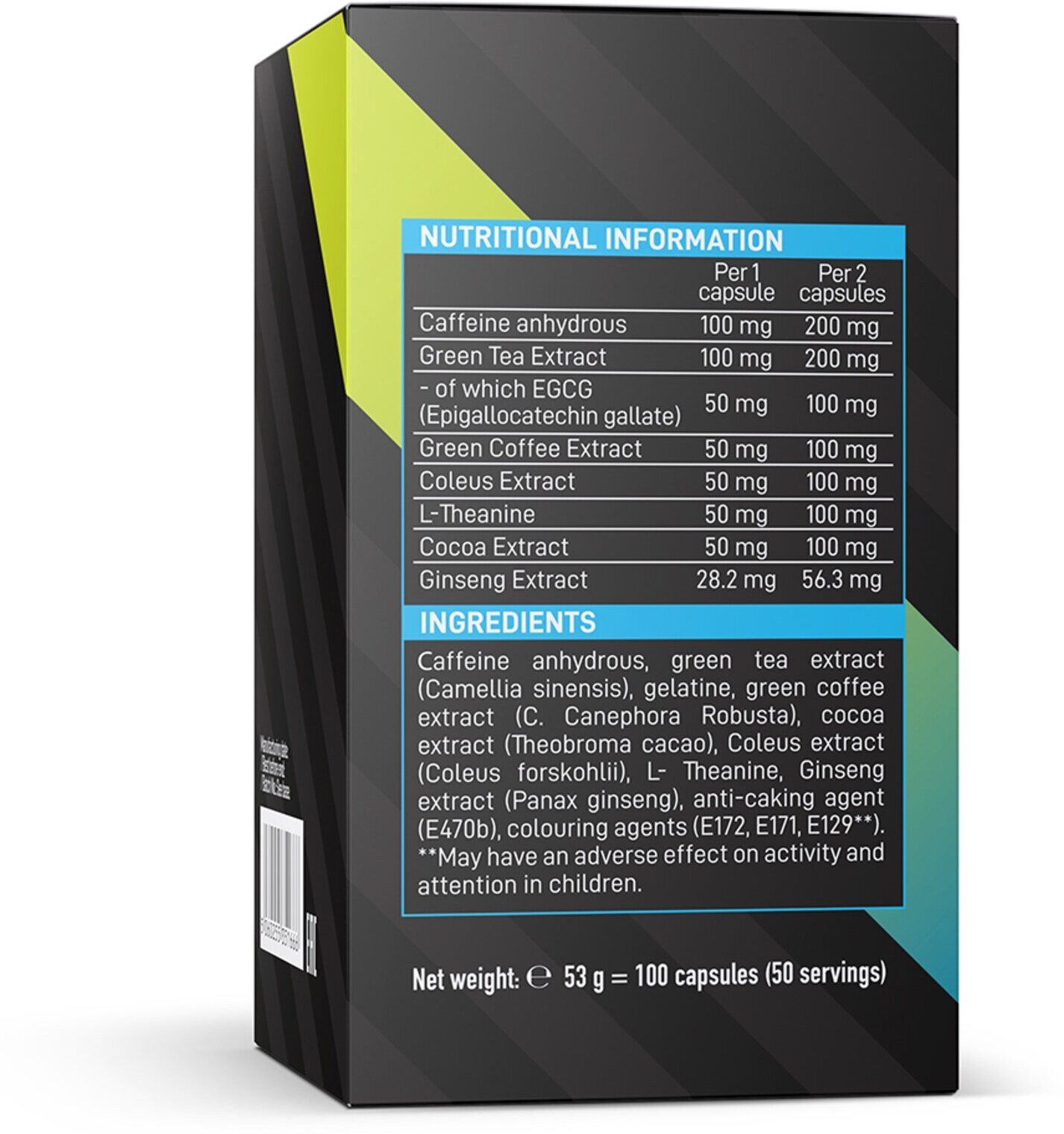 Additional Information: Contains anhydrous caffeine; composition: caffeine anhydryl, green coffee bean extract, carrier: E460, L-carnitine-L-tartrate, L-theanine, cocoa bean extract, anti-caking agents: E551, E470, black pepper extract, kale pepper powder