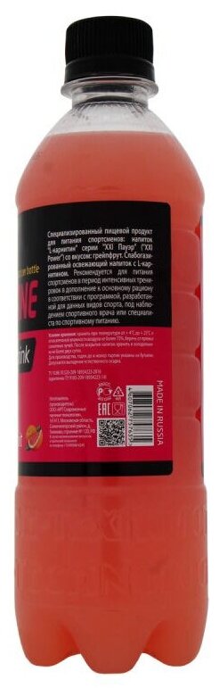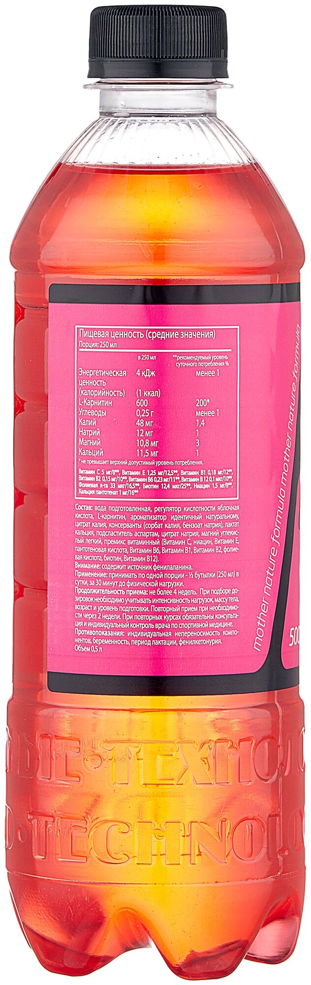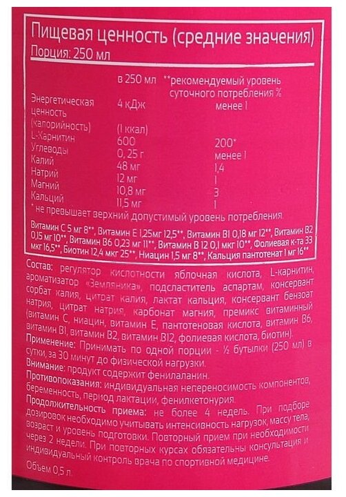 Ingredients: treated water, acidity regulator malic acid, l-carnitine, flavor identical to natural, potassium citrate, preservatives potassium sorbate, sodium benzoate, calcium lactate, aspartame sweetener, c