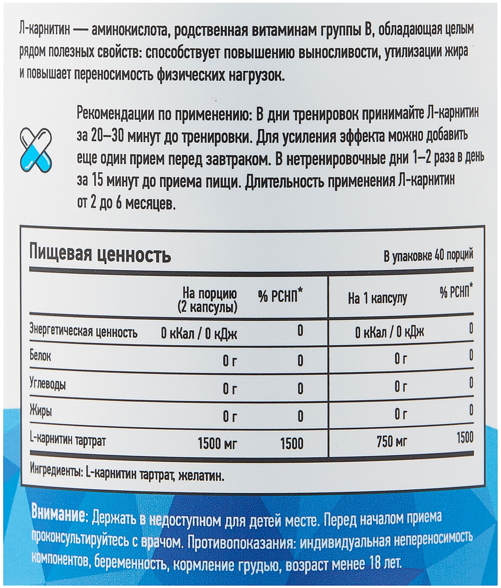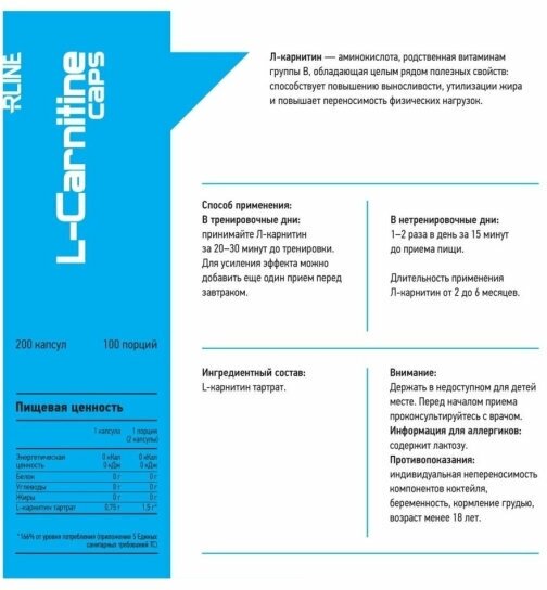 Description: Type: L-carnitine, release form: capsules/tablets, dietary features: lactose-free, for whom: for women, for men