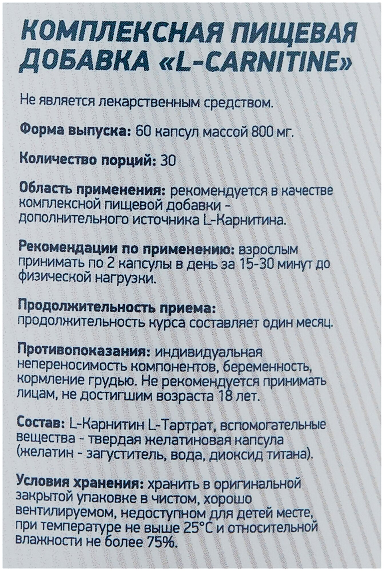 Composition: L-Carnitine L-Tartrate, excipients - hard gelatin capsule gelatin thickener, water, titanium dioxide, iron oxide - dyes; Directions for use: Take 2 capsules daily for 15-30