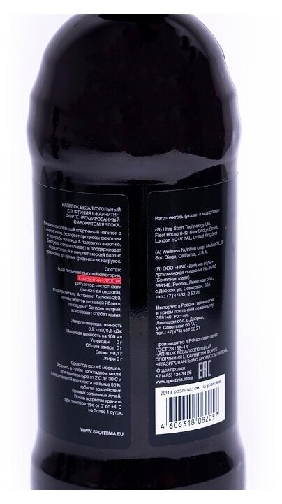 The amount of nutrients in one bottle of 500 ml: L-carnitine - 3,700 mg, vitamins B12 - 0.22 mg, C - 1000 mg, biotin - 0.03 mg, PP - 3.5 mg, pantothenic acid 1.4 mg, folic acid 75.0 mg; composition: drinking water, acid regulator