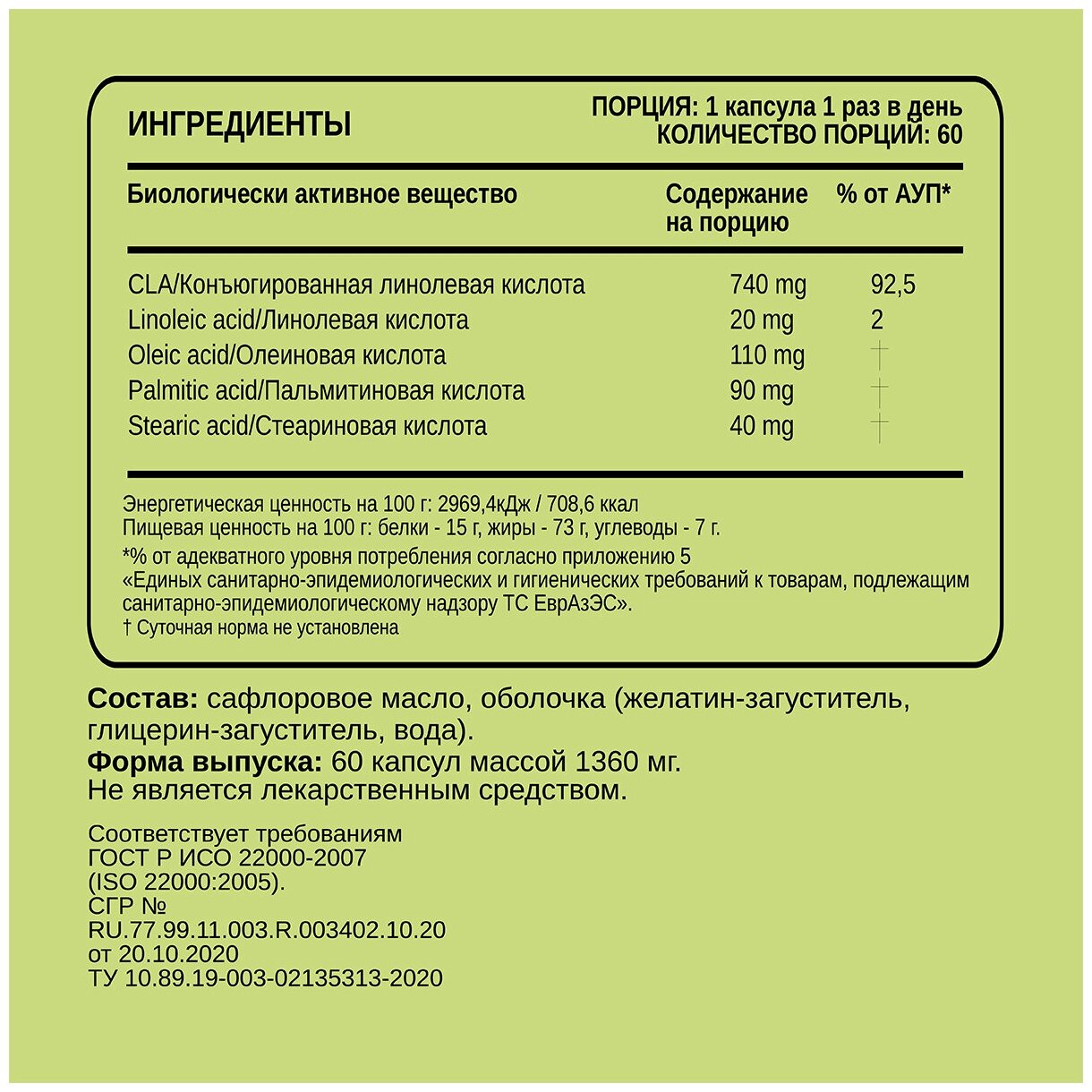 Composition: safflower oil, shell gelatin-thickener, glycerin-thickener, water; recommendations for use: adults 1 capsule 1 time per day with meals, duration of administration 1 month