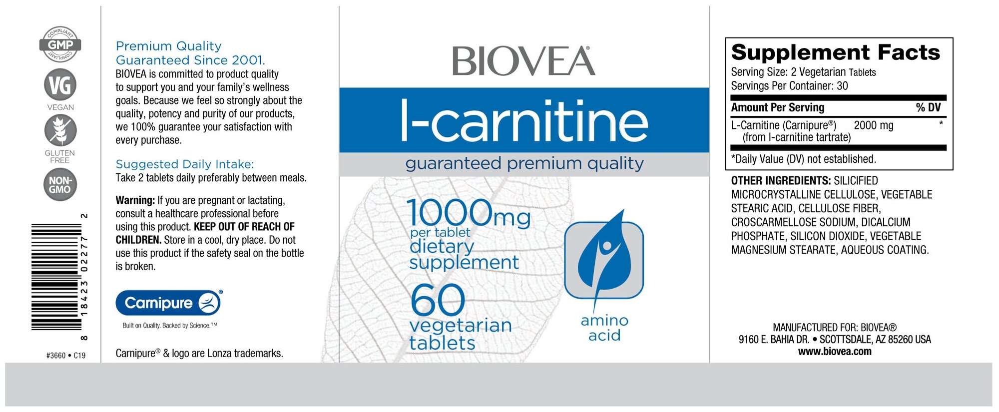 Composition: l-carnitine, silicified microcrystalline cellulose, vegetable stearic acid, cellulose fiber, croscarmellose sodium, dicalcium phosphate, silicon dioxide, vegetable magnesium stearate, aqueous coating; Suggested Use: 2 tablets daily between me