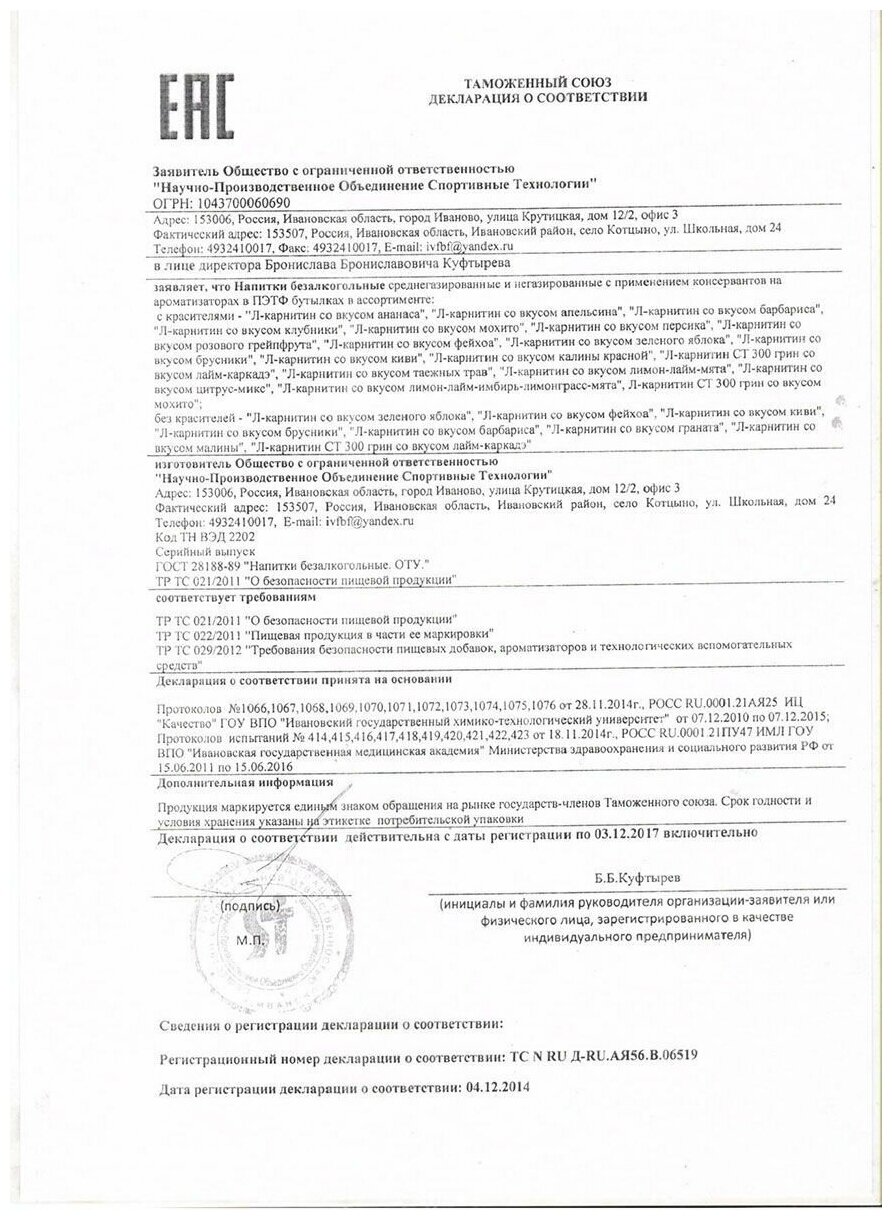 Composition: prepared drinking water, l-carnitine, green tea extract, acidity regulator - citric acid e330, flavor - "apple", thickener - konjac gum e425, preservatives: potassium sorbate e202, benzoate