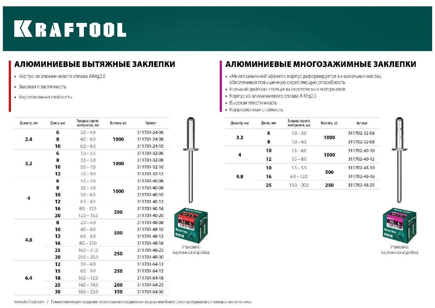 Blind rivet Kraftool Al5052 311701-24-08 2.4 mm x 8 mm