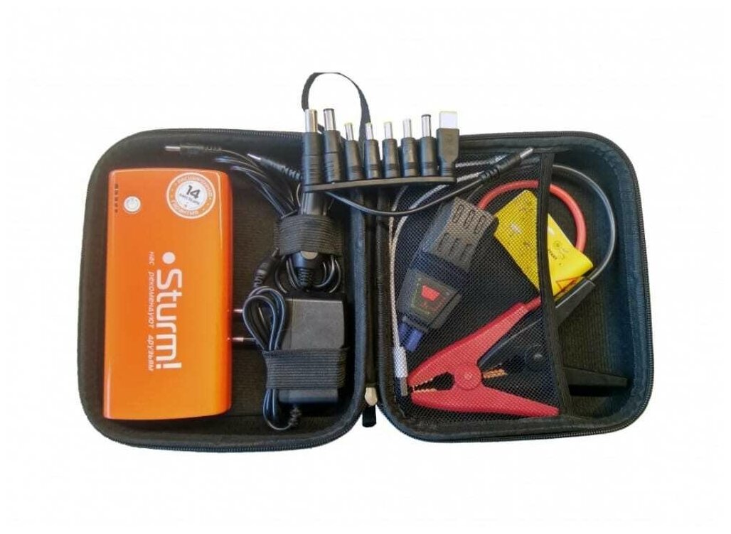 Included wall charger, cigarette lighter charger, cable for MicroUSB and iPhone, storage case, wires to start the car, adapters for charging a laptop