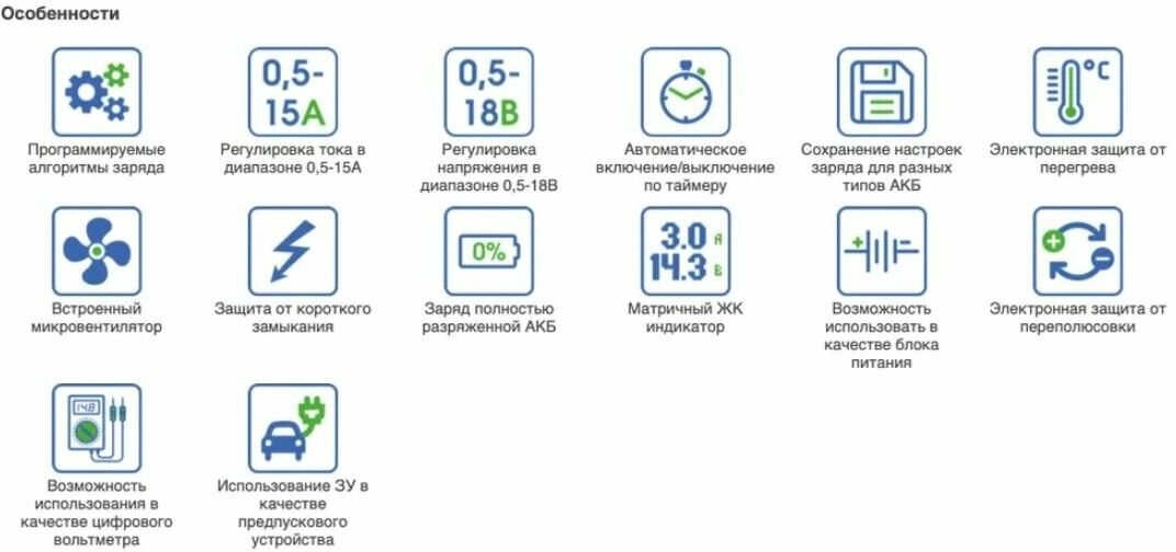 Protection against overheating, against polarity reversal, against short circuit, desulfation mode, viewing battery charge statistics