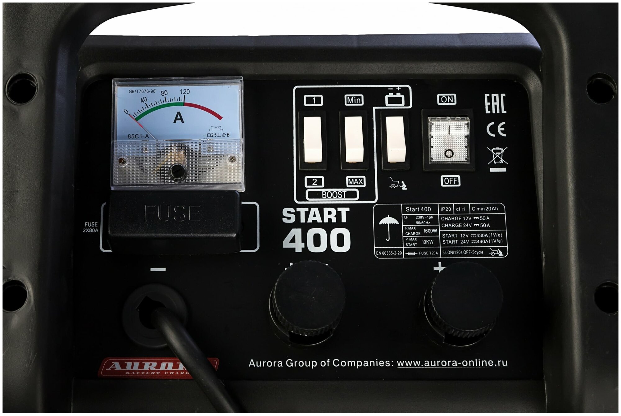 Type: start-charger, battery voltage: 12/24 V, functions: built-in ammeter, maximum starting current: 450 A, Maximum battery capacity: 700 Ah, charge current control: manual