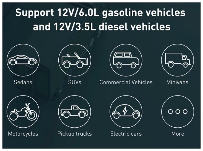 Type: starter, built-in battery, Built-in battery capacity, mAh: 12000, functions: QC 2.0 quick charge, built-in flashlight, maximum starting current: 1000 A, additional connectors: 1xUSB