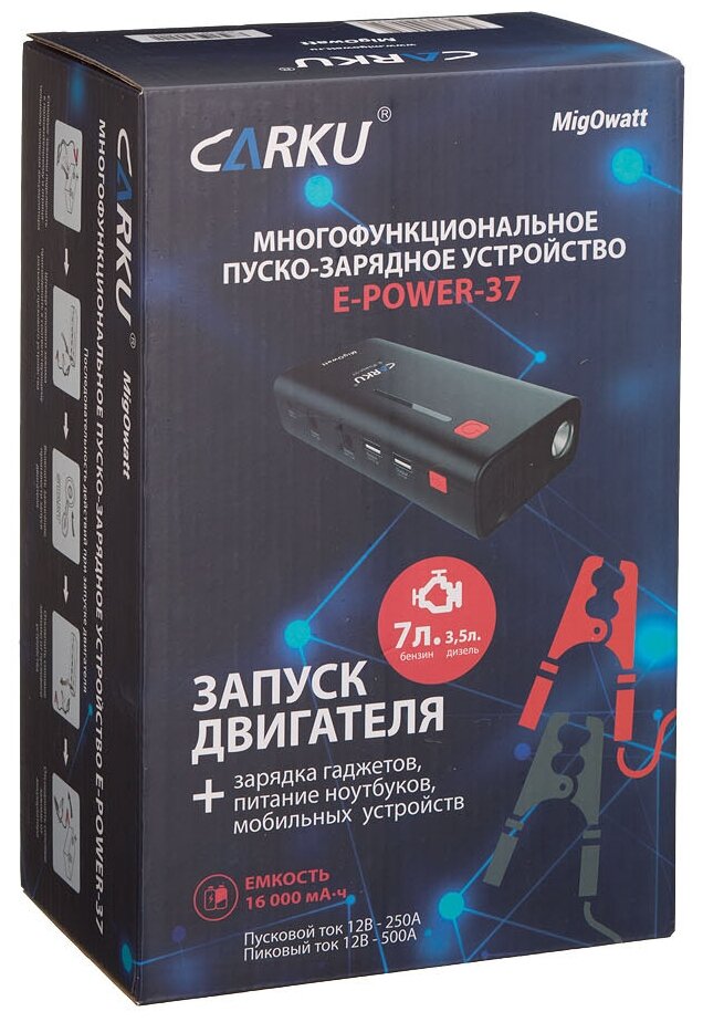 Type: starting device, battery voltage: 12 V, built-in battery, Built-in battery capacity, mAh: 16000, functions: built-in flashlight, Powerbank mobile device charging, maximum starting current: 500 A