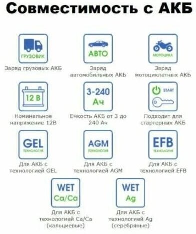 Features Optimized multi-stage charging Produces battery desulfation, increases battery life Stirring mode Checking battery, starter, alternator Electronic overheating protection Built-in microfan
