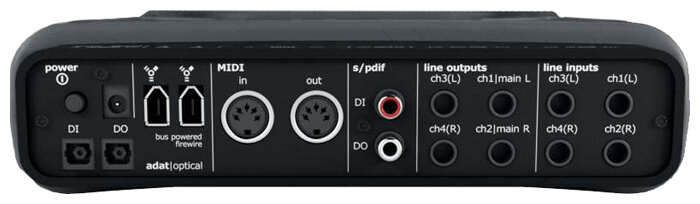 Type: external, connection type: FireWire, connectors and interfaces: ADAT support, external synchronization support, phantom power, S/PDIF digital coaxial input, S/PDIF digital coaxial output, DAC bit depth: 24, Support